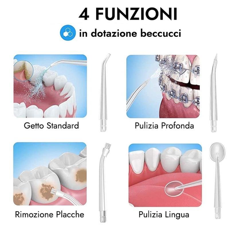 Il flusso d’acqua può pulire accuratamente le fessure dentali e gli angoli morti orali e rimuovere facilmente i batteri e i residui di cibo nelle fessure gengivali.