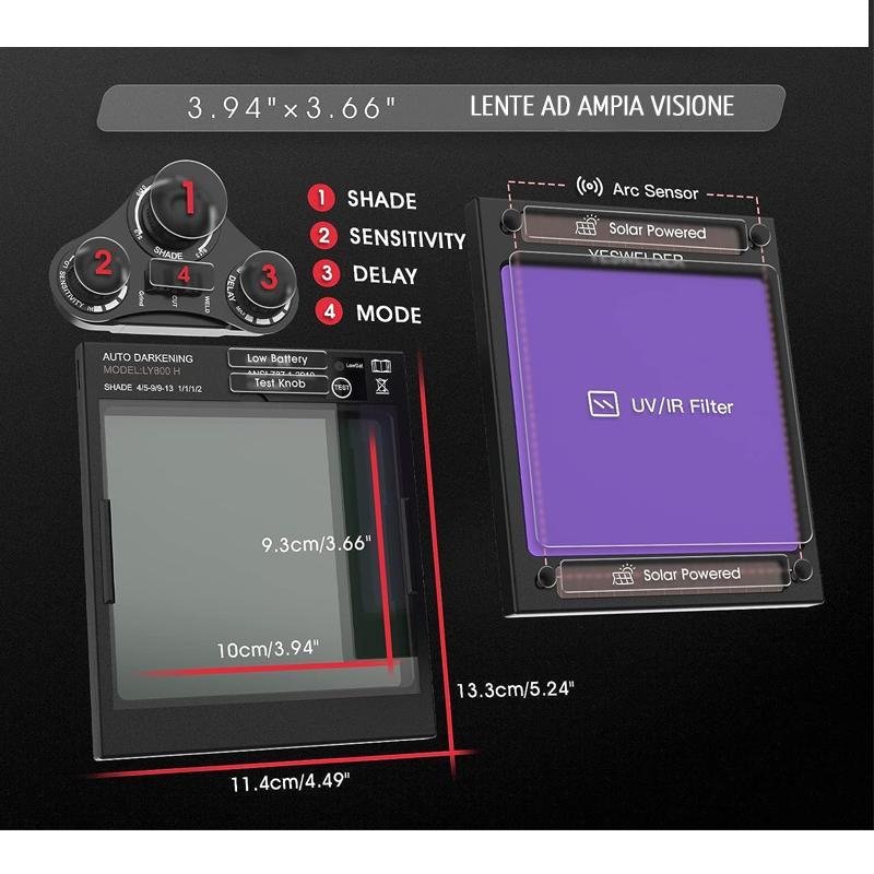 Ottima visiera con lente auto oscurante per saldare senza problemi alla vista e tenendo sempre sottocchio il punto da saldare. Realizzata in materiale di polipropilene dalla forte tenacità, anti-caduta, ottima resistenza agli urti e antispruzzo. L’isolamento del calore e la resistenza ale alte temperature fino a 130 C°, evita che il viso si bruci e protegge dalle lesioni. Maschera facciale per saldatura PQP con cambio di luce intelligente, per una visione a colori reali, ripristina la scena reale e permette una visione più chiara per evitare che i riflessi di saldatura ad arco danneggino gli occhi. Dotato di lente auto oscurante di alta qualità che viene alimentata tramite il pannello solari ad alta capacità integrato nel casco. Dotato di tre manopole per regolare a piacimento l’oscuramento, il ritardo e la sensibilità dello schermo, regolazione degli ingranaggi a doppia molatura 5-9 e 9-13. Le celle solari alimentano per anni la mini batteria in condizioni di saldatura normali. La fascia regolabile consente di regolare la misura in base alla circonferenza della testa per il massimo comfort. Il display diventerà automaticamente scuro ad ogni punto di saldatura che verrà applicato.