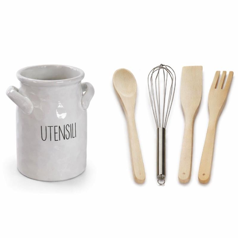 Il set include utensili essenziali per l’uso quotidiano: una frusta, una spatola piatta, un cucchiaio, un forchettone tutti dal design ergonomico e leggero per un facile utilizzo. Il supporto cilindrico in ceramica bianco, li mantiene organizzati e a portata di mano sul piano di lavoro.