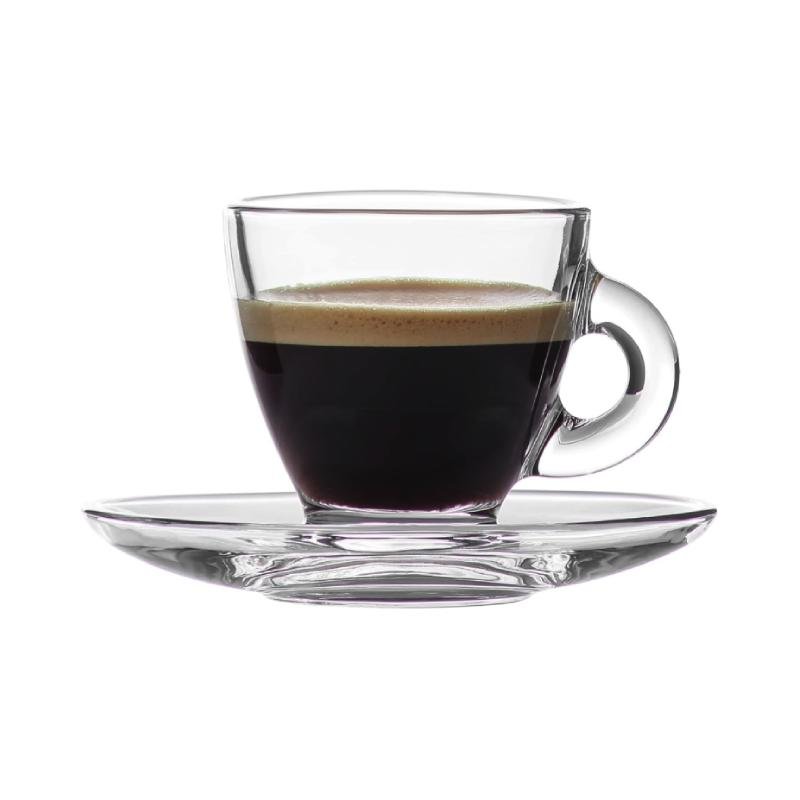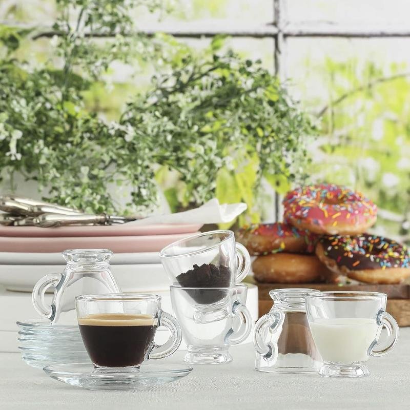 Set composto da 6 tazzine e piattini in vetro trasparente con manici.